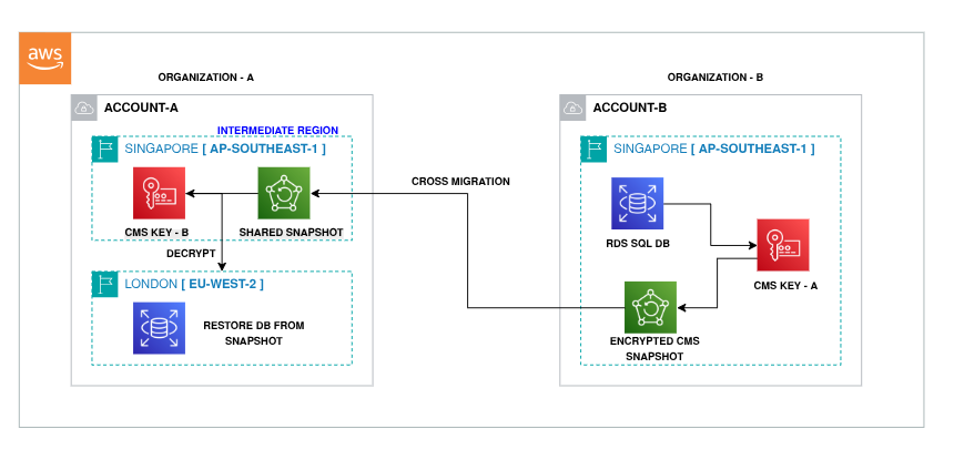 - CMS Key Sharing: Always ensure that the snapshot is encrypted using a Customer Managed Key (CMS) in Account B and shared properly with Account A. For region migration, the KMS key must be available in both accounts.