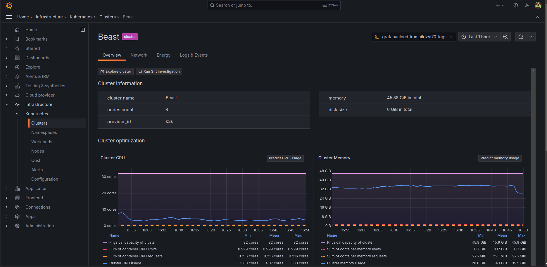 Now that everything is set up, you can start exploring your Kubernetes metrics in Grafana Cloud. You’ll see real-time insights into your cluster’s performance, including CPU and memory usage, pod health, and network traffic. You can also analyze historical trends and troubleshoot potential issues before they impact your services.