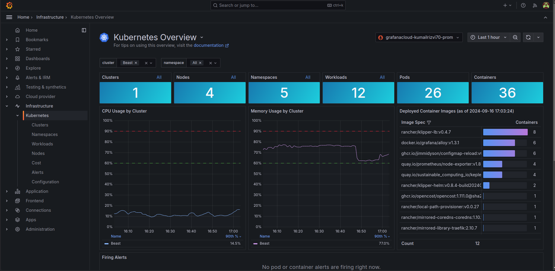 - Grafana Cloud Dashboard: Centralized visualization and analysis for Kubernetes metrics, logs, and alerts.