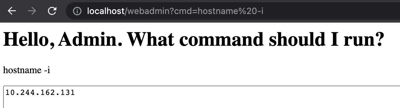 hostname -i: http://localhost/webadmin?cmd=hostname%20-i