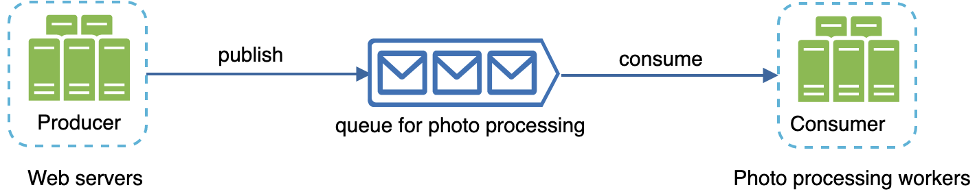 Message Queue Producer publishes photo processing jobs (Message Queue Message) to the message queue. Message Queue Consumer pick up jobs from the message queue and asynchronously perform photo customization tasks